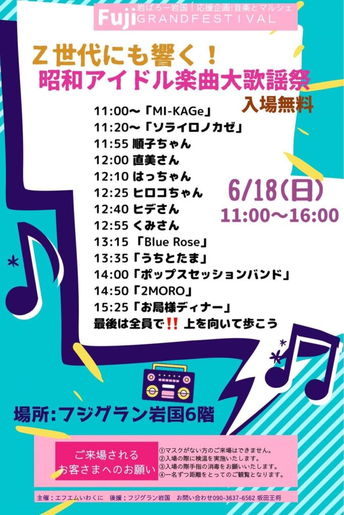 Z世代にも響く!昭和アイドル楽曲大歌謡祭 0 2023-05-182023-05-20 イベント詳細 日付: 2023-06-18 11:00 – 11:15 会場: フジグラン岩国6階 カテゴリ: MI(みぃ) 11:00からMIさんとしてかげさんと出演MI-KAGeというチームでマッチの曲を演奏! 日時:2023年6月18日(日)11:00〜16:00 会場:フジグラン岩国6階 入場無料 出演者&タイムスケジュール 主催:エフエムいわくに / 後援:フジグラン岩国