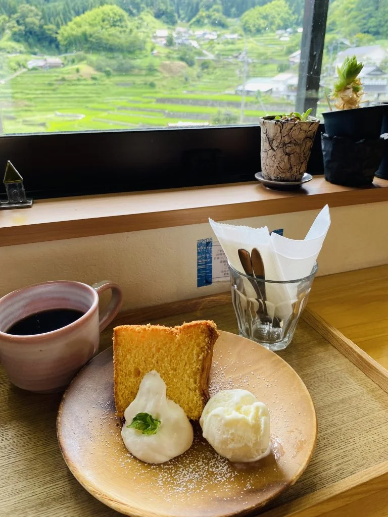 店内でレッスンが始まりましたが、ワタクシは優雅に窓から棚田を眺め、オカリナの優しい音色を聴きながら、シフォンケーキセットをいただくという贅沢な時間をすごしました。